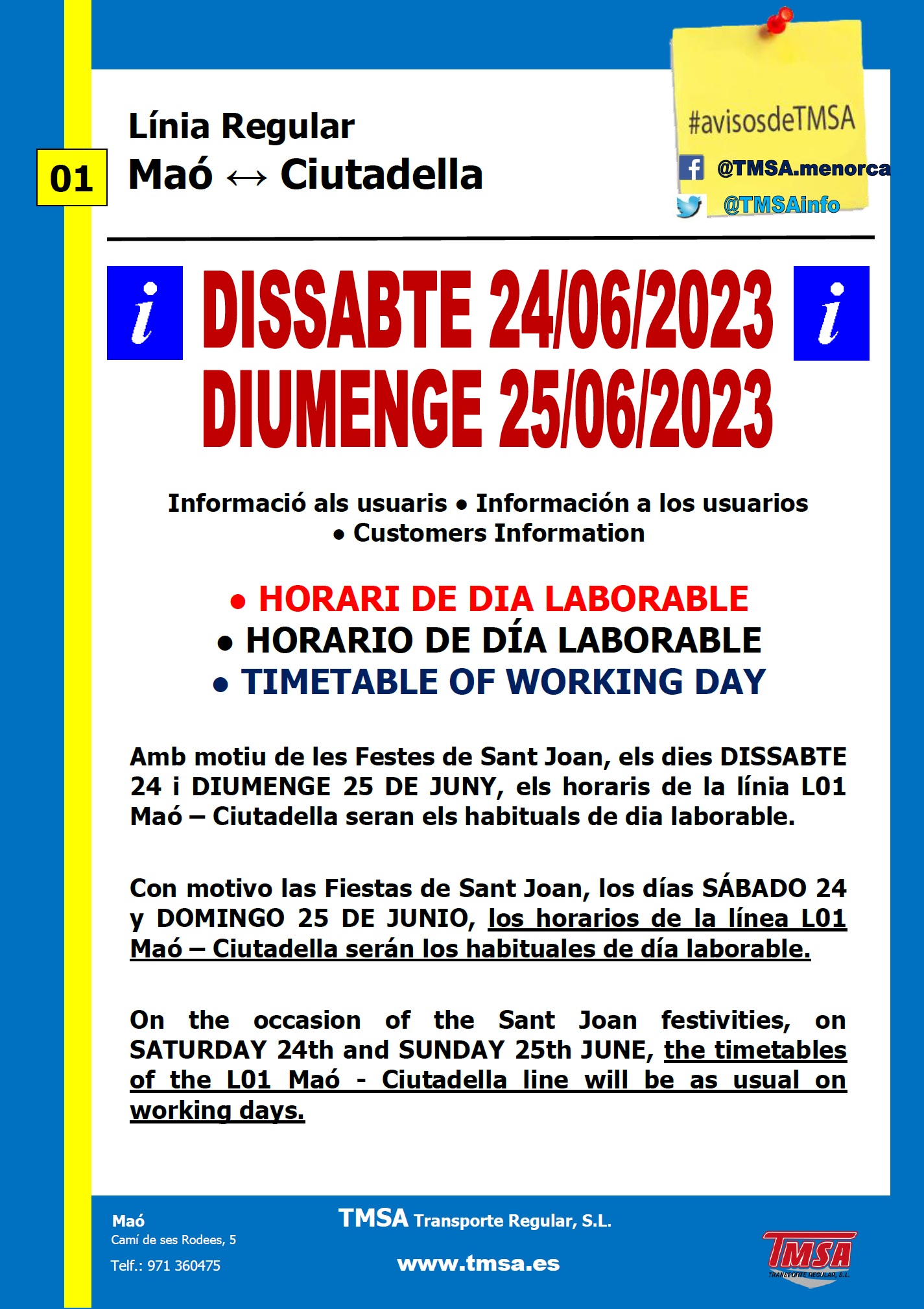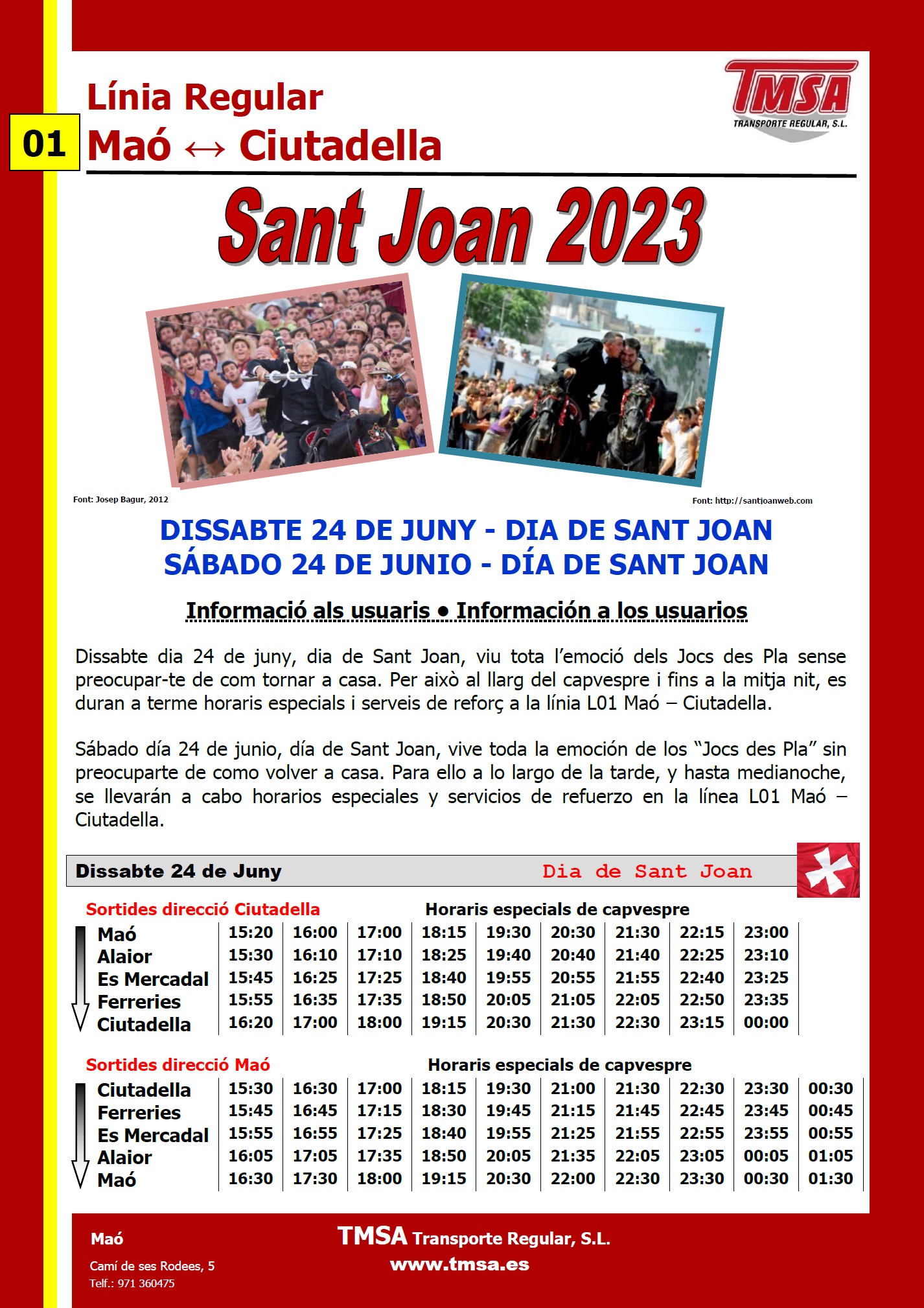 El próximo SÁBADO 24 de junio con motivo de la celebración de las Fiestas de San Joan, además de los horarios habituales de día laborable, se llevarán a cabo horarios especiales en la L01 Maó - Ciutadella.