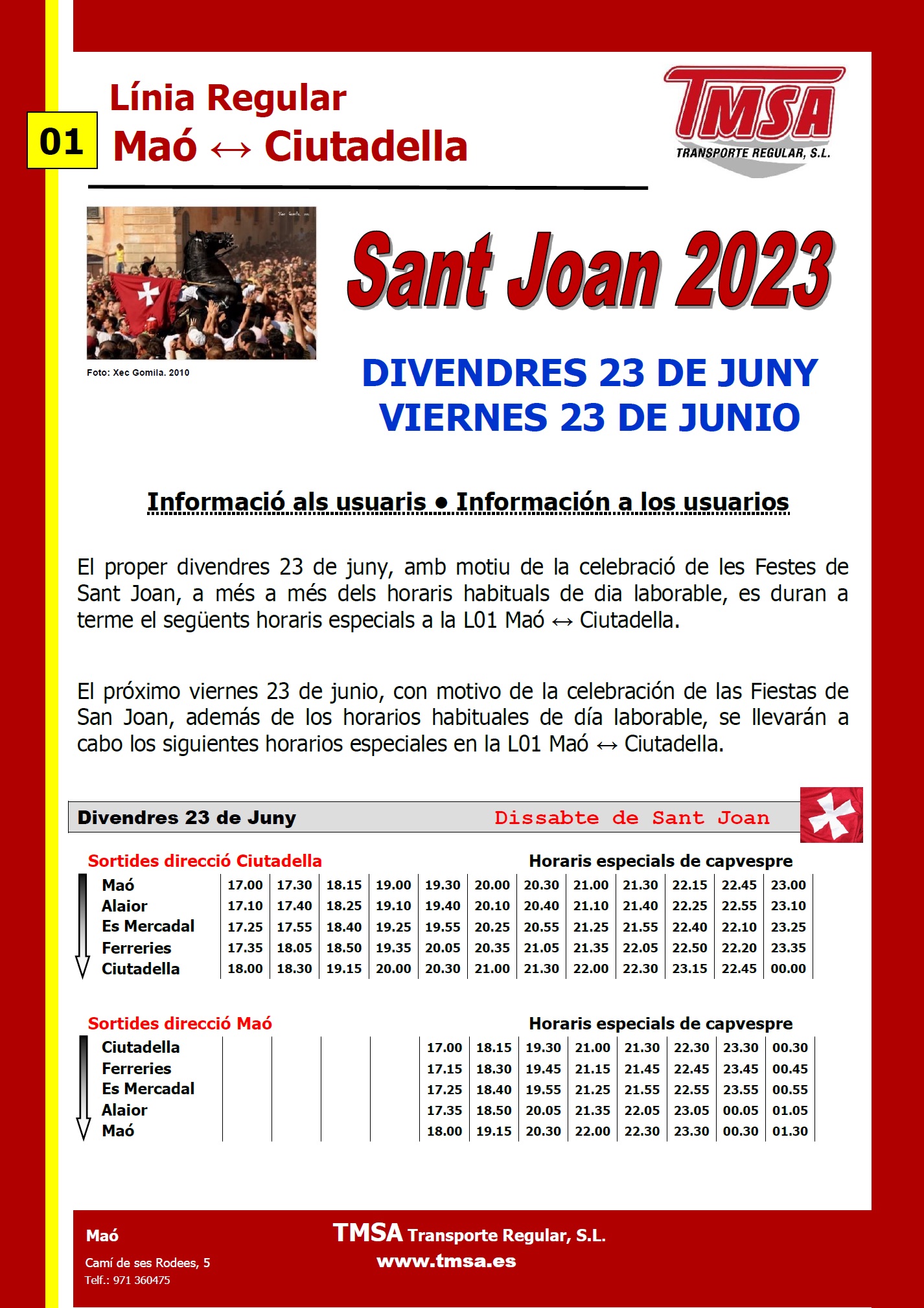 El próximo viernes 23 de junio, con motivo de la celebración de las Fiestas de San Joan, además de los horarios habituales de día laborable, se llevarán a cabo horarios especiales en la L01 Maó - Ciutadella.