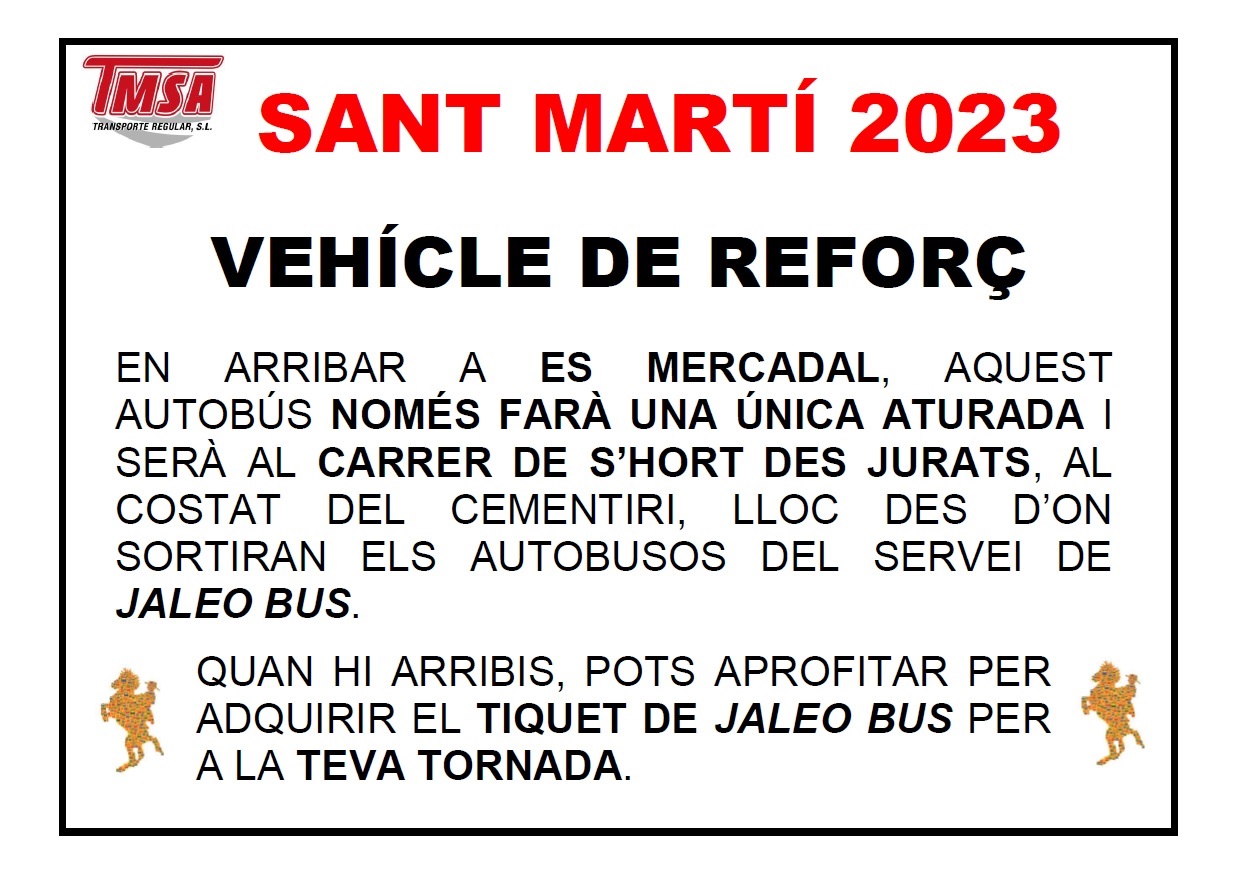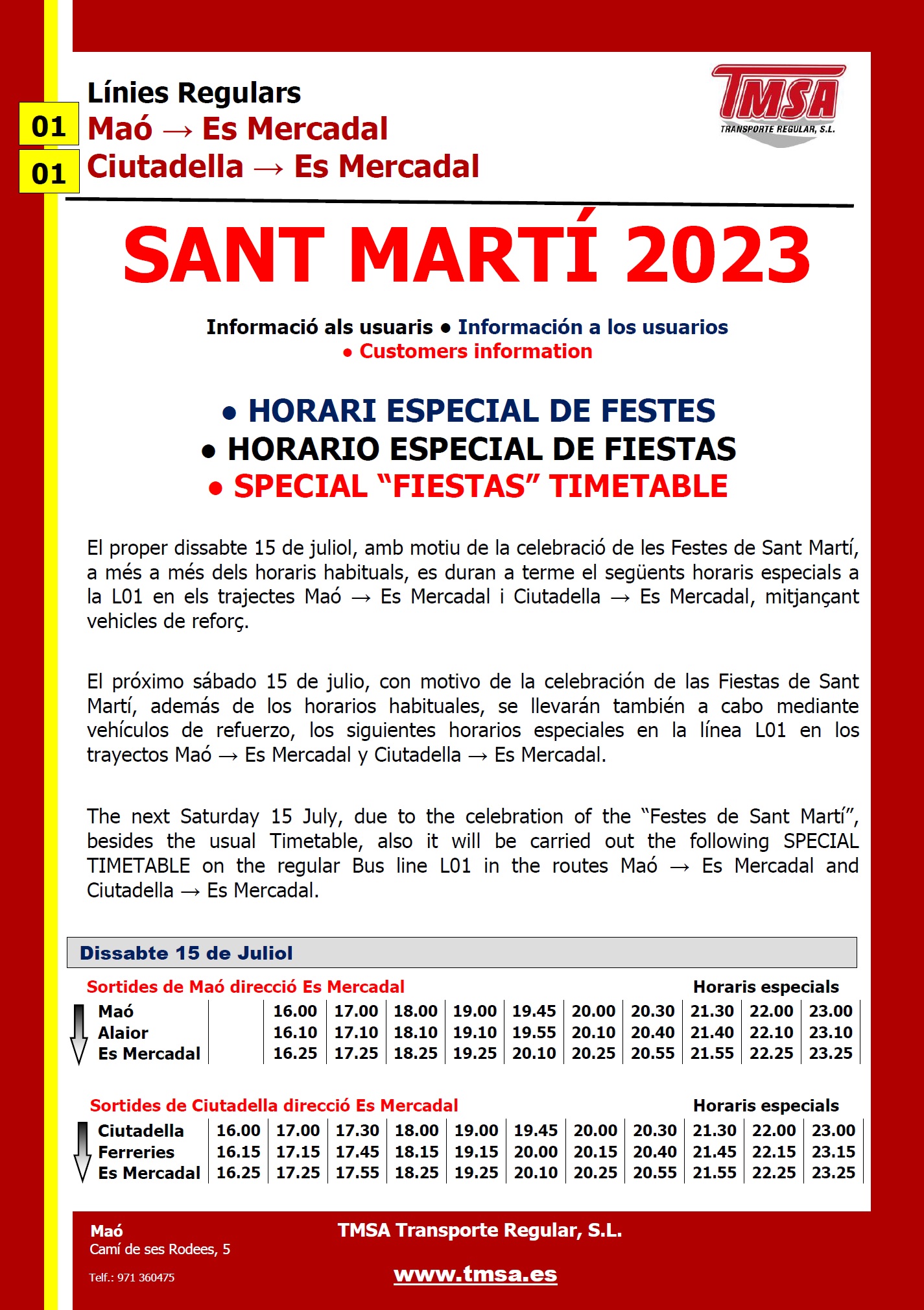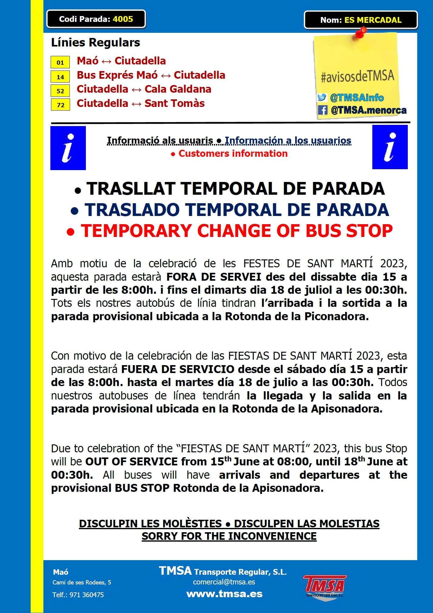 Con motivo de la celebración de las FIESTAS PATRONALES DE SANT MARTÍ 2023, la parada habitual en Es Mercadal estará FUERA DE SERVICIO desde el sábado 15 de julio a las 08:00h. y hasta el martes 18 de julio a las 00:30h. Se ubicará una nueva parada provisional junto a la Rotonda de la Apisonadora.